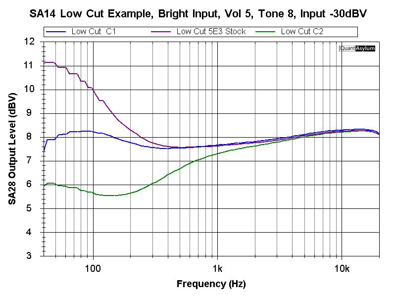 The original 5E3 circuit can have too much low end at times (especially with humbuckers), and there is no bass control (see the freq. response plots). To compensate for this, we have added a switchable low-cut feature (on the back) that includes an attenuation shelf on the lower end frequencies. It is a 3-position switch, all the way to the left is the original 5E3 stock, C1 reduces this bump by about -3dB, and C2 by about -5dB and pulls out more low mids. Set this to your preference based on your needs. Rest assured, you can always have the stock 5E3 circuit if/when desired by placing the switch all the way to the left. The second plot shows a preferred setting where the bright input is used, Low Cut in C1 position, and tone control set to taste. This flattens out the low-end and the highs are adjusted to taste with the tone control.