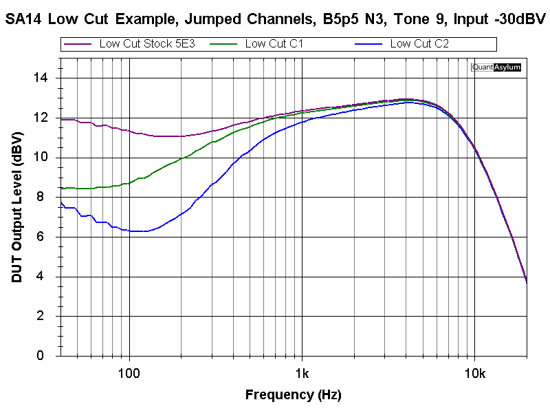 As with the original 5E3, you can also jump the channels and mix the normal and bright inputs. The final plot shows the channels jumped, Bright Vol. at 5.5, Normal at 3, Tone at 9, and shows the three Low Cut settings in that scenario.