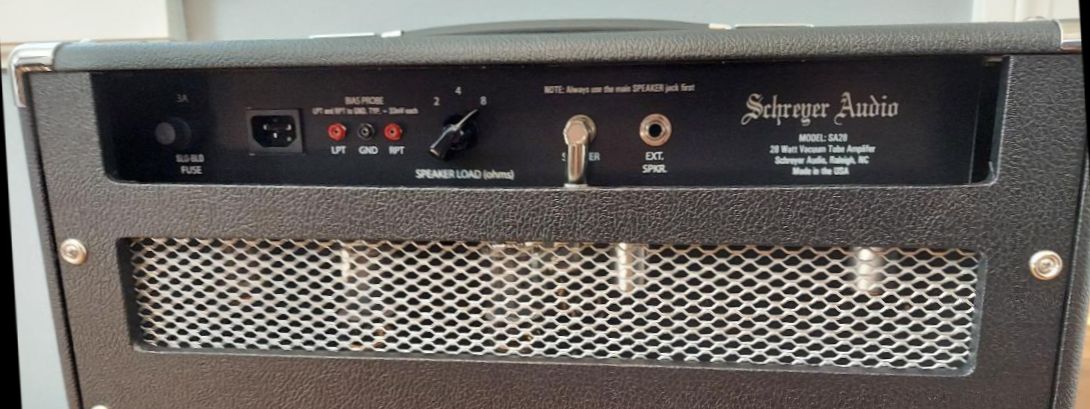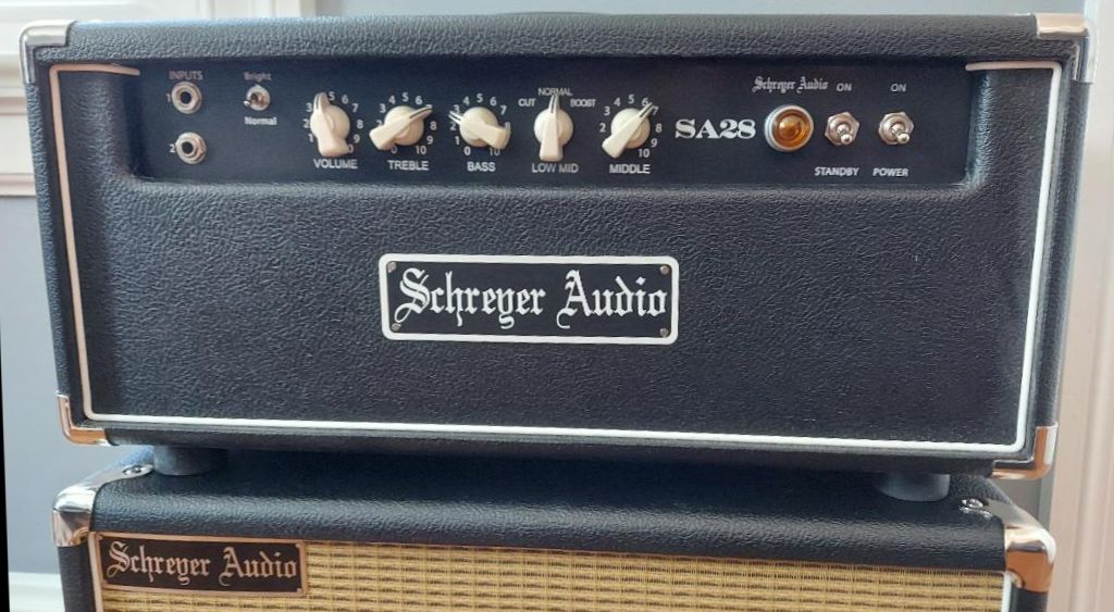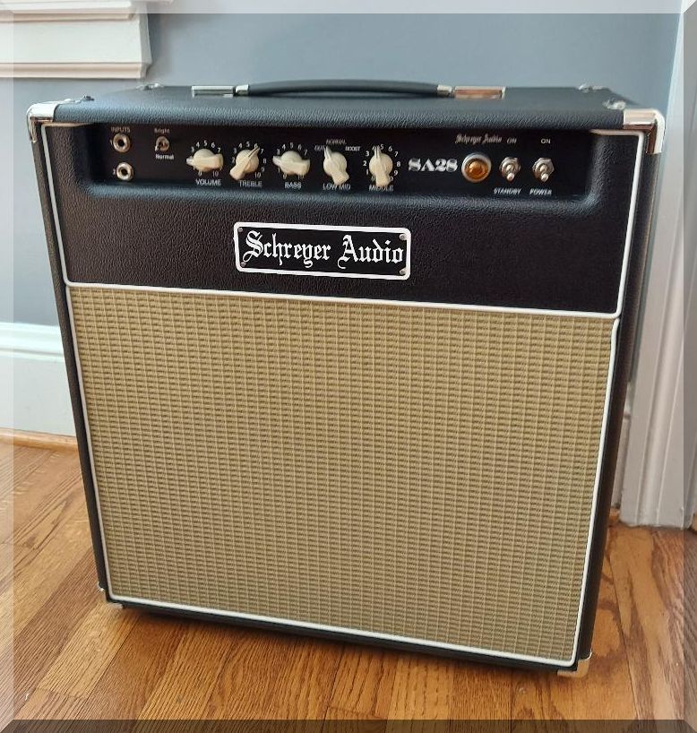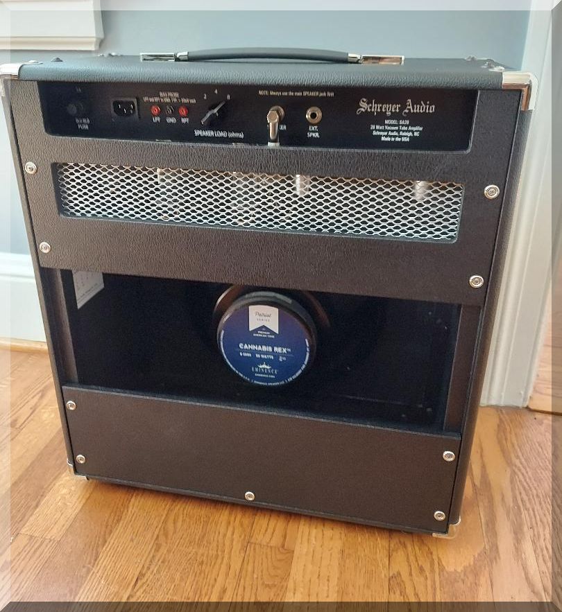 The SA28 is an original Schreyer Audio design. A surprisingly loud and punchy 28 watts from a dual 6L6 fixed bias output stage driven by a split load (Cathodyne) phase inverter. Two input jacks (#1 High full input) , #2 Low (-6dB), can also patch out full. A bright/normal switch, Volume, and a Treble, Bass, Middle tone stack. In addition, we offer a unique and very versatile low mid shape switch. This switch offers control of the low mids in order to dial in your tone depending on the particular guitar and cabinet/speaker combination you are using. Whether it’s a single coil or humbuckers, 12’s or 10’s, closed back or open, the low mid shape is a subtle yet useful tone sculpting feature. It loves pedals, so put your pedal board in front for all the effects you want and you are good to go. Using a very direct signal path, the SA28 has a great immediate and percussive response to your playing. Implementing a split load (Cathodyne) phase inverter opens up some Tweed character that adds clarity and richness when pushing the amp (as in the Tweed Pro, Bandmaster, and Super). At the same time, the 5AR4 rectifier maintains ample headroom before natural breakup. Housed in a smaller 20″ wide cab, it is a manageable size and weight, but plenty loud. An impedance switch is included on the back (2, 4, 8 ohm positions), and two speaker jacks wired in parallel (always use main speaker jack first). Outside bias probe points are included and an external trim pot so power tube bias can be done with a simple volt meter and without removing the chassis. The combo comes with an Eminence Cannabis Rex Hemp cone speaker (8 ohm). This speaker complements the amp well with a strong bold tone, bell like highs, yet a nice organic feel from the hemp cone.